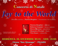 Domenica 26 dicembre 2010 ore 19.00, Chiesa di San Giuseppe - FilianoCon il patrocinio del Comune di Filiano avrà luogo il tradizionale Concerto di Natale dal titolo Joy to the world. La direzione artistica è di Patrizia Borghini dell’Associazione Art Academy. Si esibiranno Patrizia Borghini (soprano), Roberta Giannini (mezzo soprano), Rocco Mentissi (pianoforte), Domenico Picciani (flauto) e Vito Stano (violoncello).